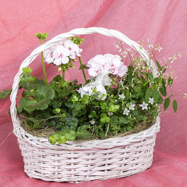 Valkoisessa sangallisessa pajukorissa kaksi pelargonia, poutapilvi, muratti ja muurikello.