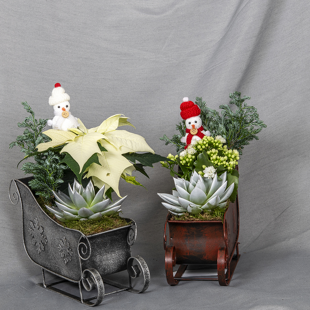 Metallisen reen kyydissä kulkevat kotimainen valkoinen joulutähti sekä Boulevard sypressi ja mehiruusuke tai punainen tulilatva, Boulevard sypressi ja mehiruusuke.