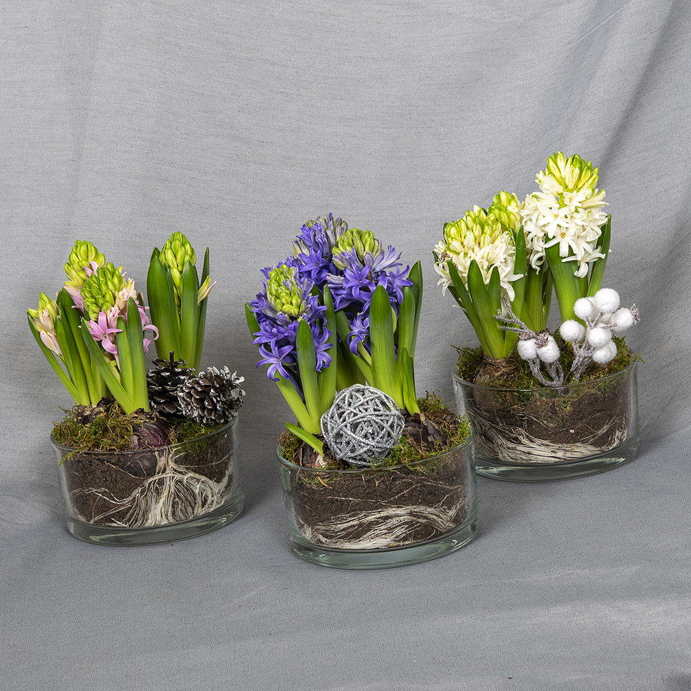 Lasimaljaan istutettuna kolme valkoista, sinistä tai vaaleanpunaista hyasinttia.