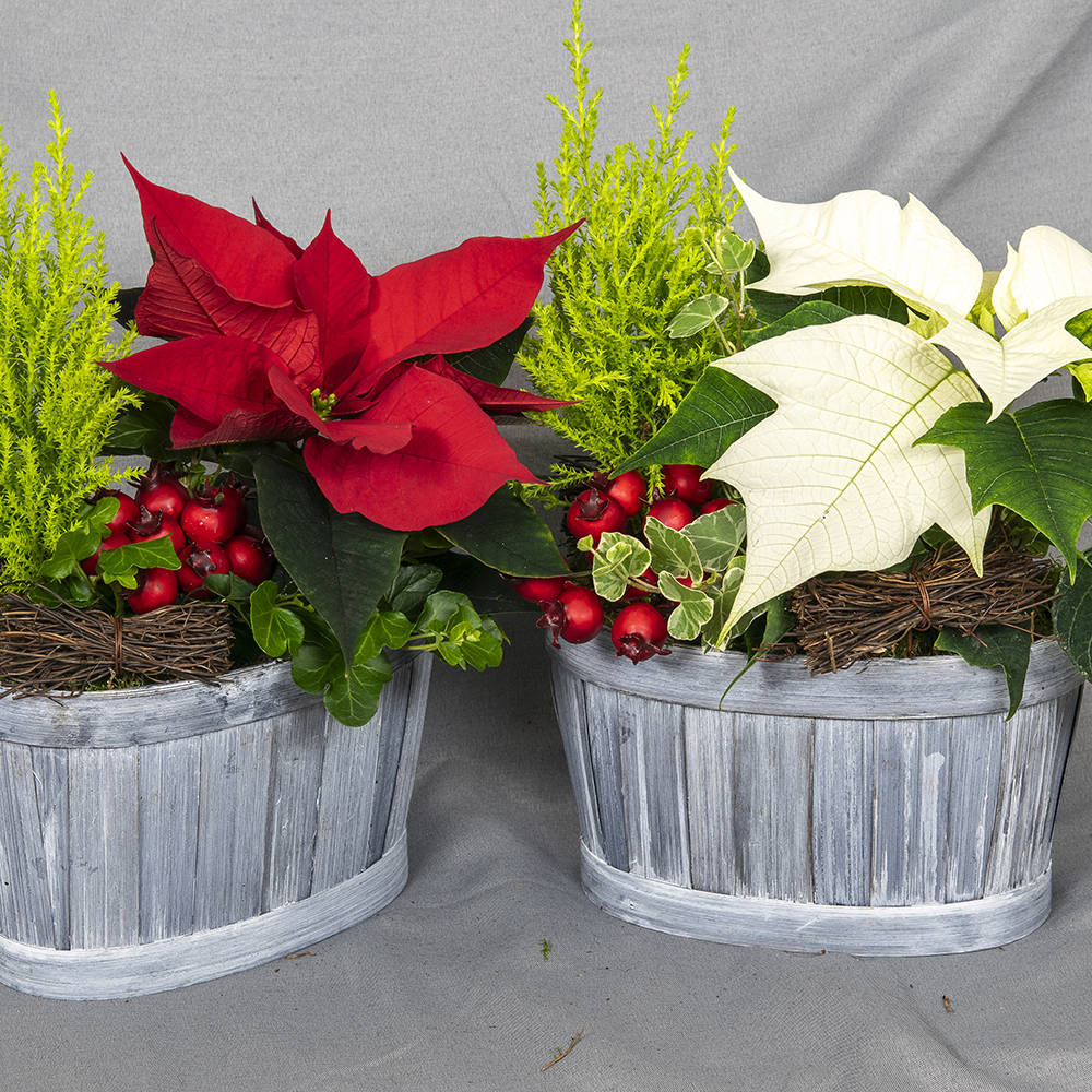 Istutuksessa kotimainen punainen tai valkoinen joulutähti, muratti ja raikkaanvihreä kultasypressi