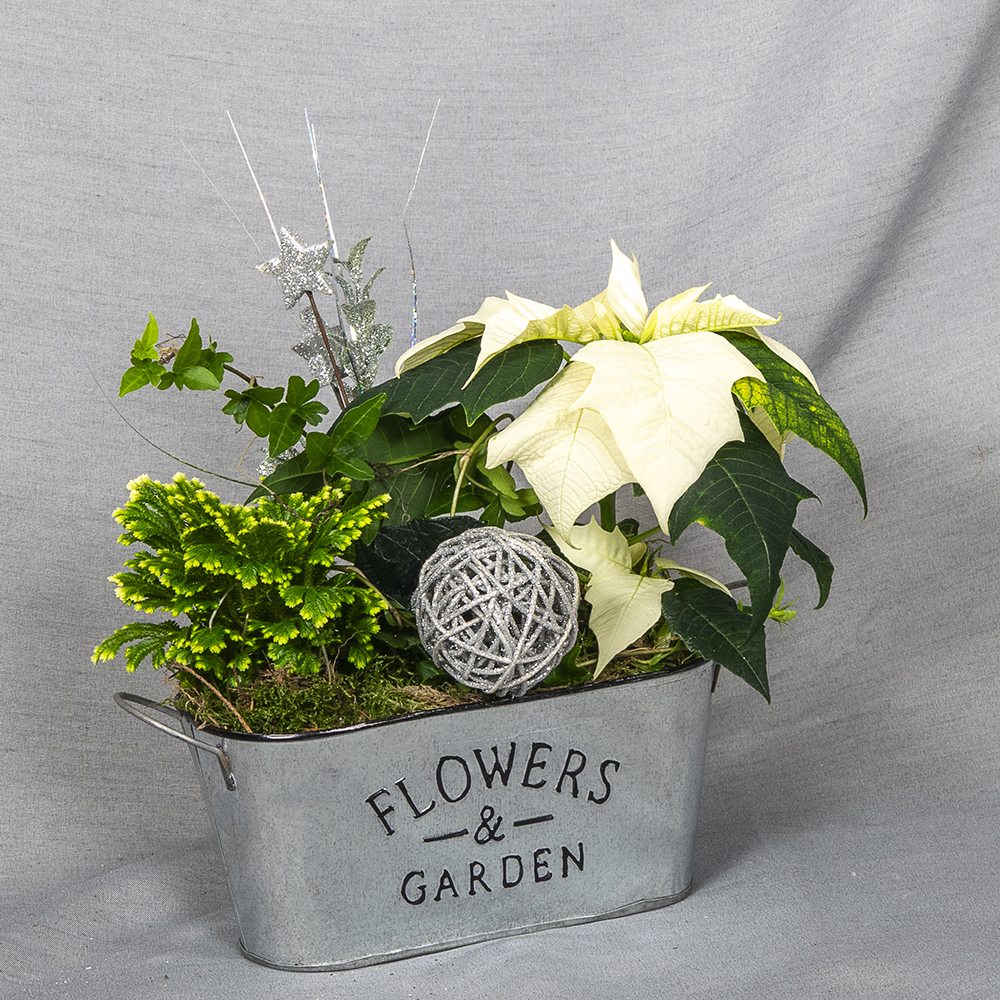 Sinkkiruukussa punainen tai valkoinen joulutähti sekä vihreät mähkä ja muratti.