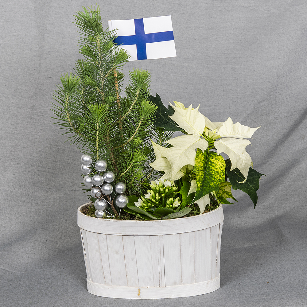 Itsenäisyyspäiväksi juhlava istutus valkoisessa lastukorissa.