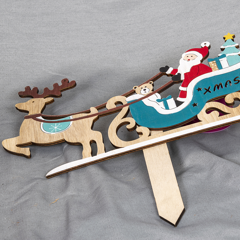 Vanerisessa koristeessa joulupukin reen edessä porossa ja reessä lahjoja