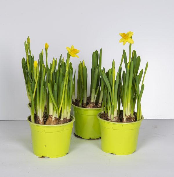 Ruukkunarsissit myydään ø 12 cm limen- tai keltaisen värisissä muoviruukuissa. Purkissa on useita sipuleita.