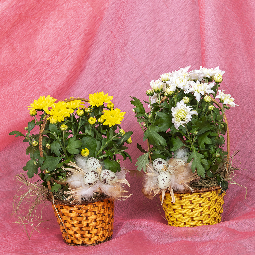 Oranssissa tai keltaisessa pikkukorissa keltainen tai valkoinen krysanteemi