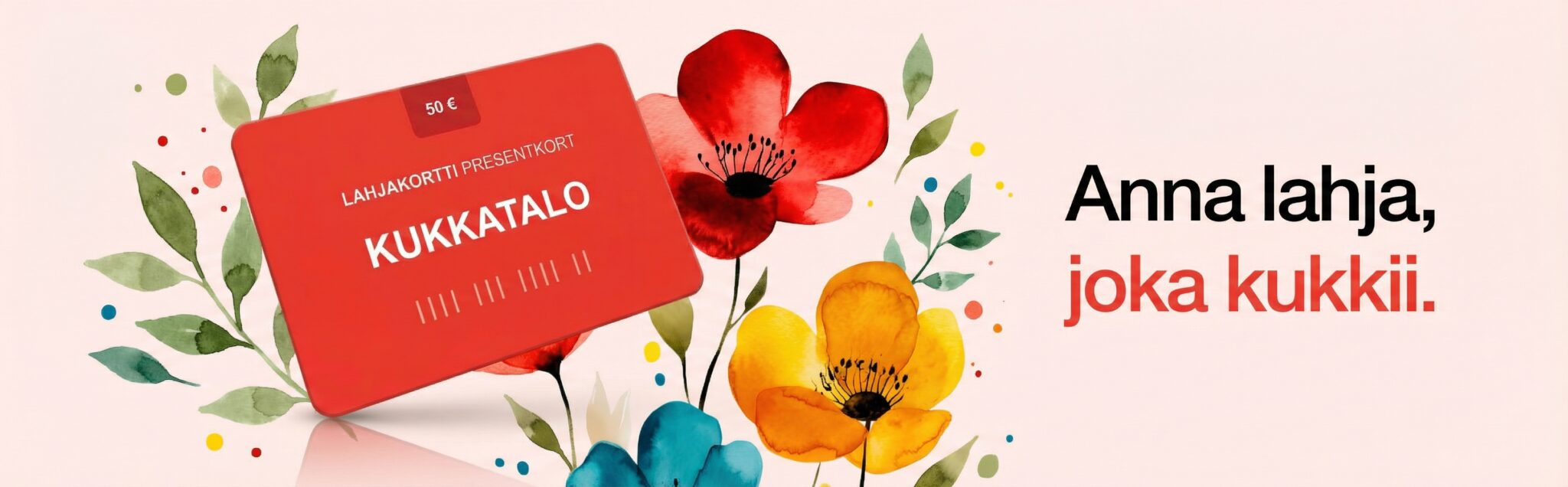 Kukkatalon digitaalinen lahjakortti on helppo antaa ja ihana saada. Saaja voi valita itse kukat, kasvit tai sisustustuotteet mistä tahansa myymälästämme – aina mieluinen ja ajankohtainen lahja!