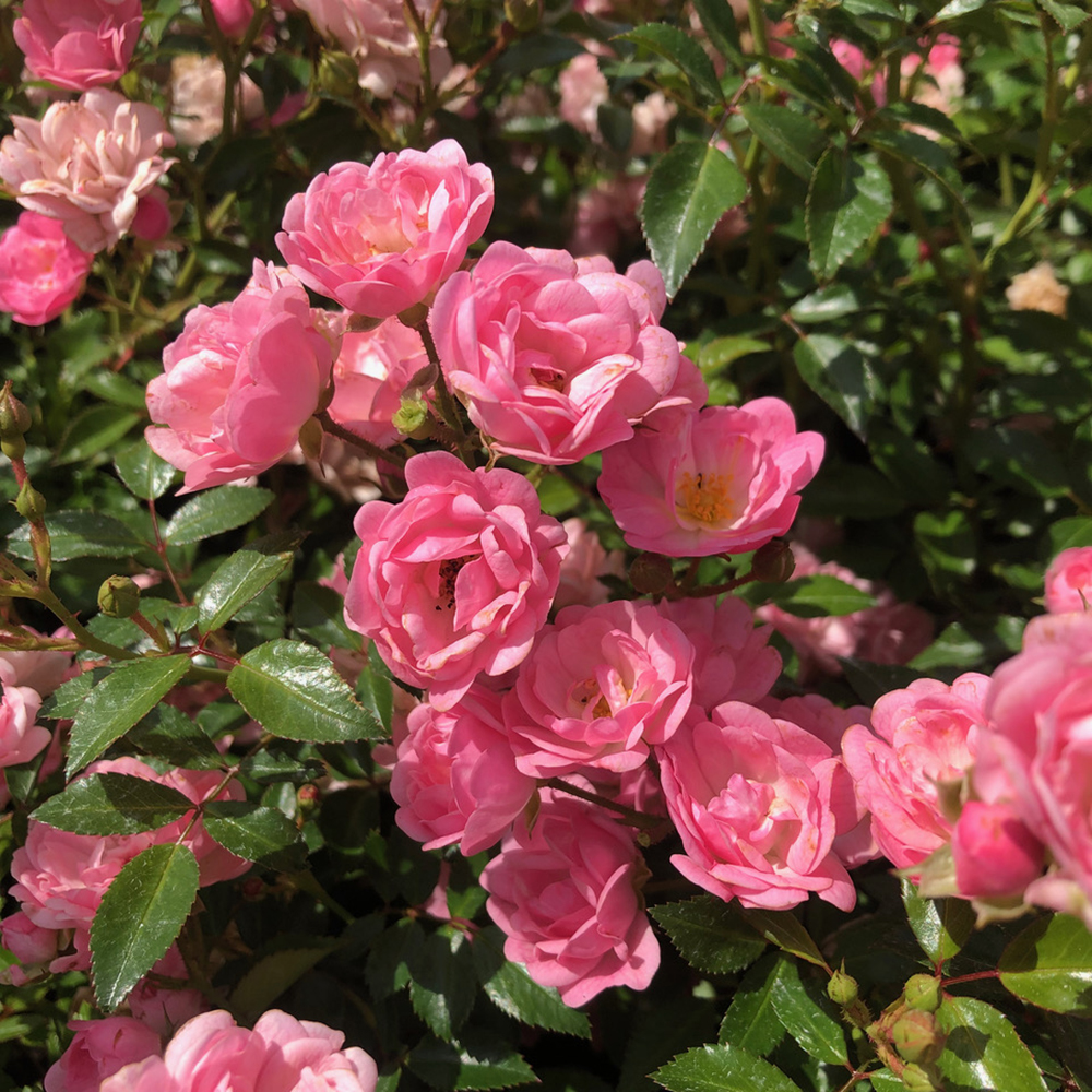 Intensiivisen roosat, pienet, kerrotut kukat isoissa tertuissa. Mietotuoksuinen.