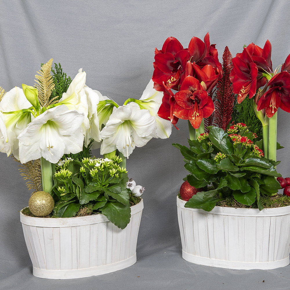Näyttävässä jouluistutuksessa kaksi kotimaista valkoista tai punaista amaryllistä, valkoinen tai punainen tulilatva sekä vihreä sypressi.