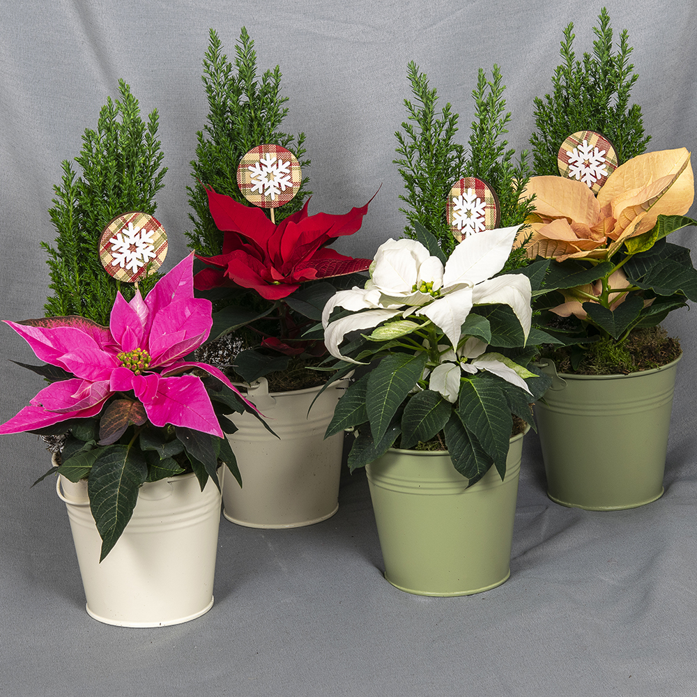 Vihreässä tai kermanvärisessä sinkkiämpärissä kotimainen joulutähti ja vihreä sypressi