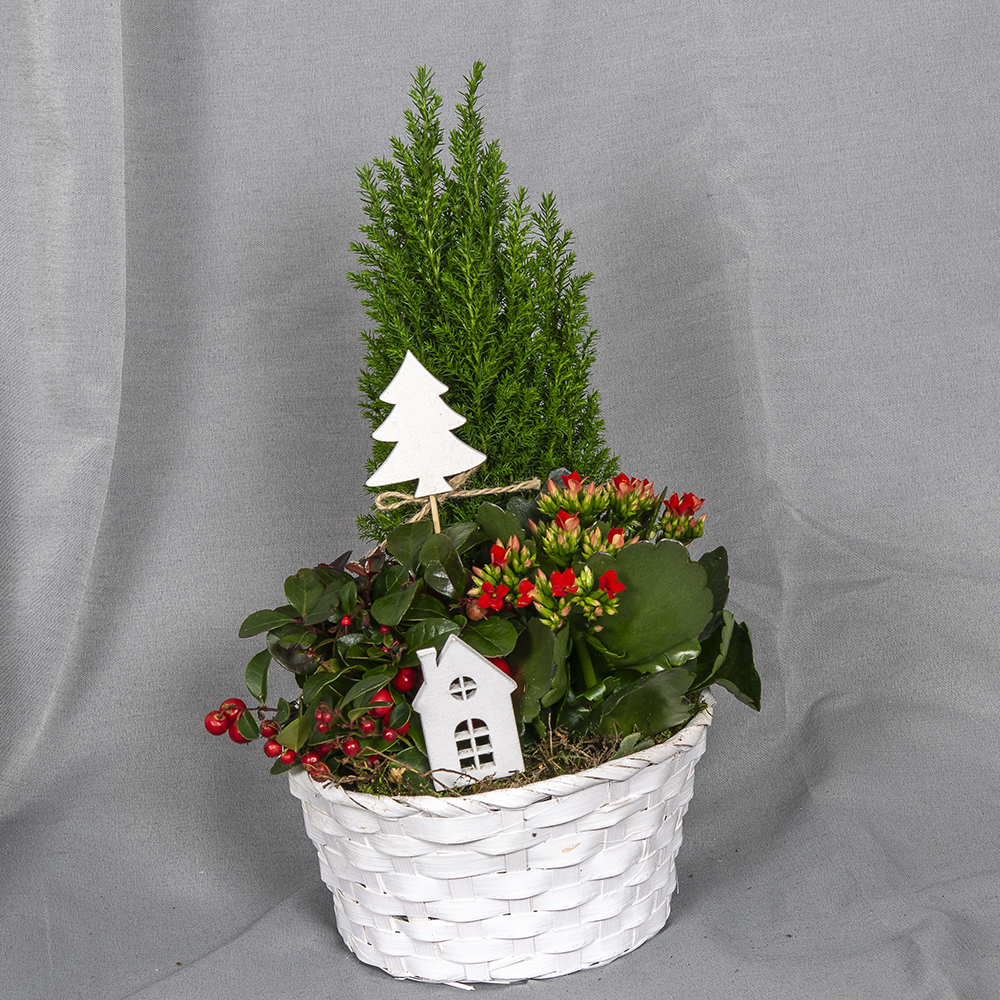 Valkoisessa korissa punamarjainen lamosalali, punainen tulilatva ja vihreä sypressi.