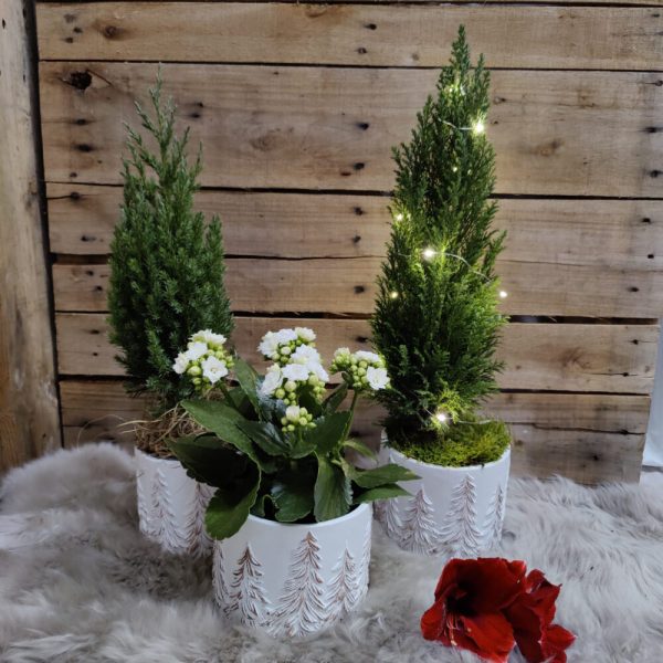 Kaunis valkoinen suojaruukku, jonka koristeena kuusia.