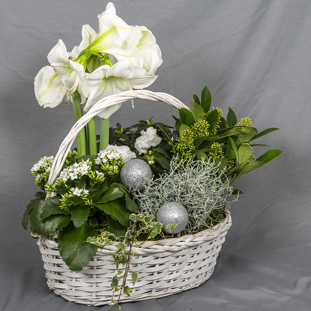 Pajukoriin istutettuina kotimainen amaryllis ja tulilatva sekä ruukkuatsalea, skimmia, muratti ja hopealanka